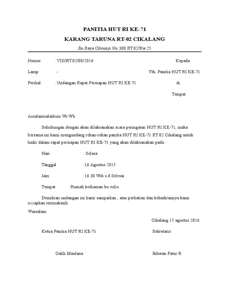 Contoh surat undangan rapat karang taruna desa acara 17 agustus. Surat undangan karang taruna pertemuan/rapat untuk 17 agustus. Silahkan kunjungi postingan contoh surat undangan rapat karang taruna desa acara 17 agustus untuk membaca artikel selengkapnya. Download version download 64 file size 1584 kb file . 3 contoh surat resmi bahasa sunda karang taruna persiapan 17 agustus.